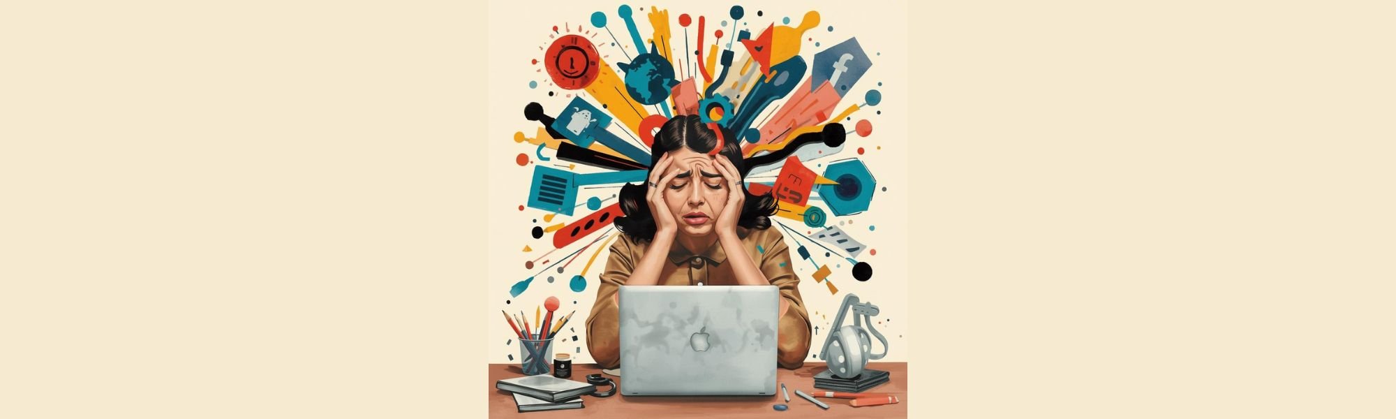 Illustration of an overwhelmed woman at her laptop with colorful symbols of tasks and distractions exploding behind her, representing ADHD and workplace productivity challenges.